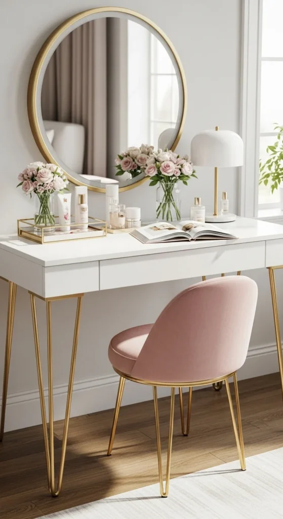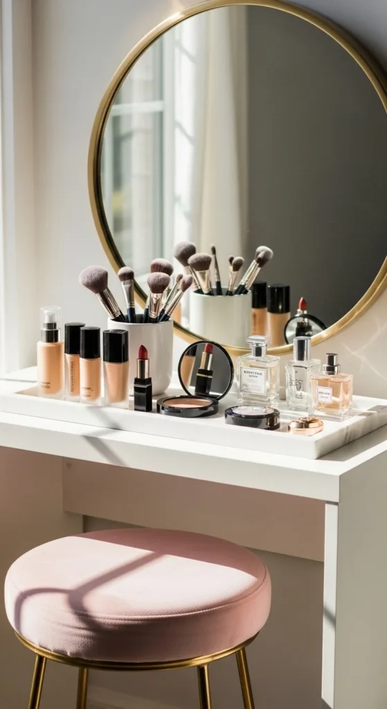 A chic and functional vanity blends beauty with organization. Keep the surface simple, use trays to curate your essentials, invest in good lighting, and add personal touches that make the area feel inviting.