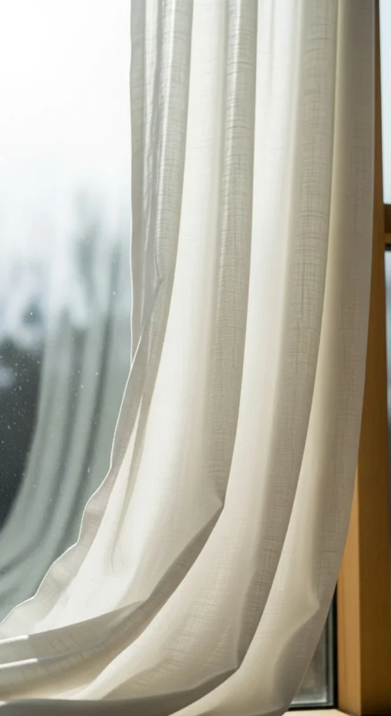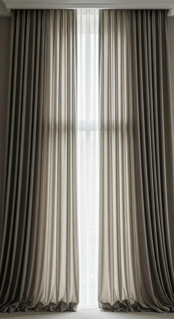 Long panels draw the eye upward. They instantly make the room feel taller. Choose lightweight fabrics that drape well. Mount your rod close to the ceiling instead of right above the frame. This small change completely reshapes the space. If the panels feel plain, add pleat clips for texture. You don’t need expensive custom curtains—store-bought panels work well when steamed for a clean look. For a DIY trick, combine two inexpensive panels to create a fuller appearance. This helps wide windows look balanced. Avoid overly thick fabrics if your room is small. Keep the panels slightly longer so they “kiss” the floor for a soft finish.