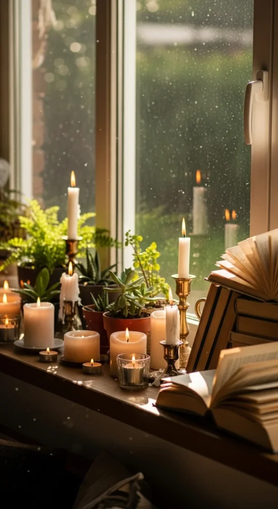 A decorated sill works like a tiny display shelf. Keep it simple so the space doesn’t look cluttered. Use a mix of candles, plants, and small décor items. Books stacked horizontally add charm. If your sill is narrow, choose slim objects like taper candle holders. You can also place a small tray to keep everything organized. Swap items seasonally for easy updates. If your sill paint looks worn, give it a quick sanding and fresh coat—it instantly looks cleaner. Adding LED candles keeps things safe near curtains.