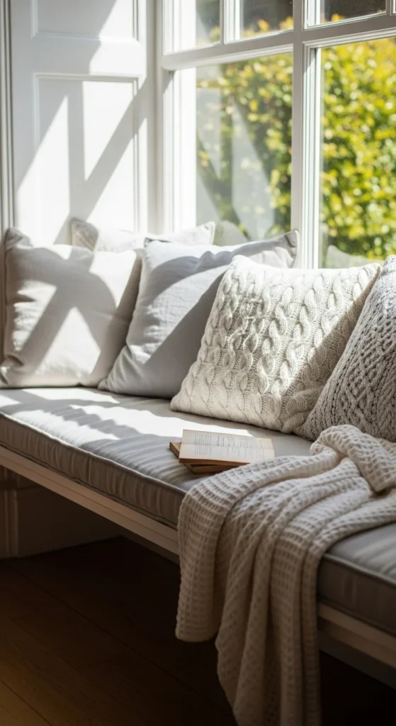 A window bench creates a relaxing corner. Add cushions and a throw for comfort. Build a simple bench using plywood and foam for a low-cost project. If you prefer no tools, use a sturdy storage bench and place it under the window. This setup makes reading nooks or morning coffee spots extra inviting. Keep the bench color light to match the window area. If you want storage, choose a bench with lift-up lids or drawers. Add small pillows in colors that complement your curtains or blinds.