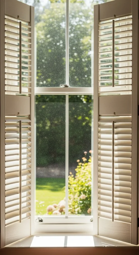 Shutter panels bring charm and structure. They work well in kitchens, entryways, and sunrooms. You can install them inside the frame for a clean look. Paint them to match your wall or give them a distressed finish for a rustic touch. Many budget-friendly shutters come preassembled. If you prefer flexibility, choose café-style shutters that cover only the lower half of the window. They’re great when you want privacy but still want sunlight. Keep hinges clean so panels open smoothly.