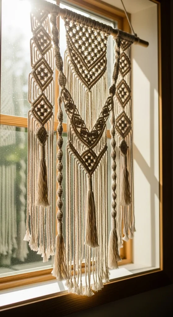 Macramé panels add texture. They work well in boho-themed rooms. You can hang them using simple hooks or rods. Many creators sell affordable handmade pieces. If you want something personal, try making a small panel yourself using cotton rope. Keep the pattern open so plenty of sunlight still enters. Macramé pairs nicely with plants and wooden furniture. Use neutral colors to keep the look calm. Trim any loose ends for a neat finish.