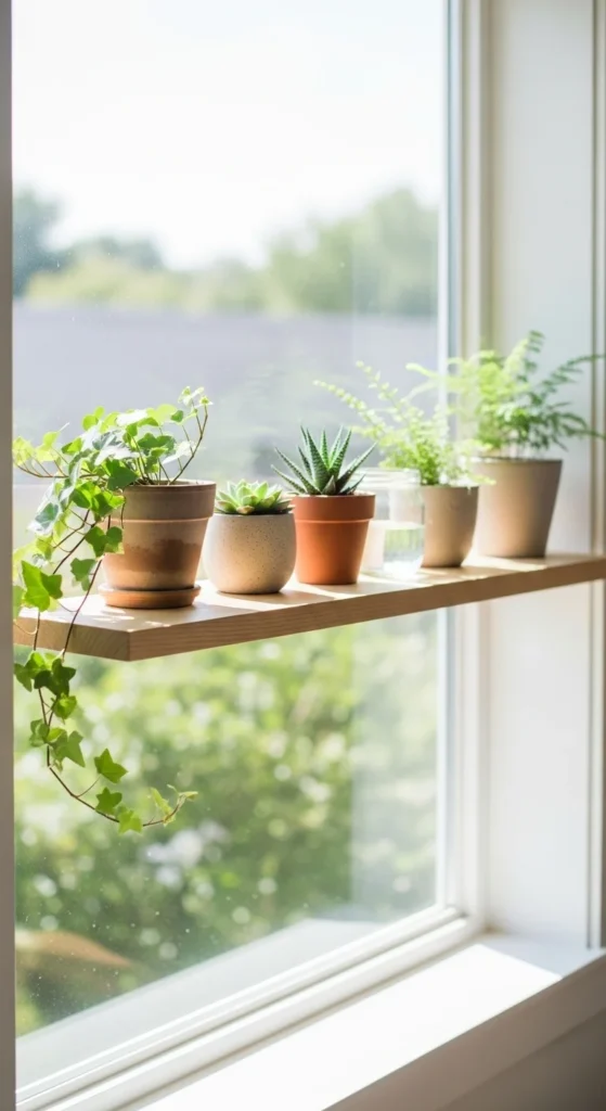 A window shelf is a clever way to display plants or décor. Use clear acrylic if you want a floating effect. Wooden shelves add warmth. Install brackets inside the frame or use suction-cup shelf supports for renter-friendly setups. Place small pots or glass vases on the shelf. If your plants need lots of light, this is a perfect spot. Keep the shelf narrow so it doesn’t block the window. Clean it often to keep dust from showing.