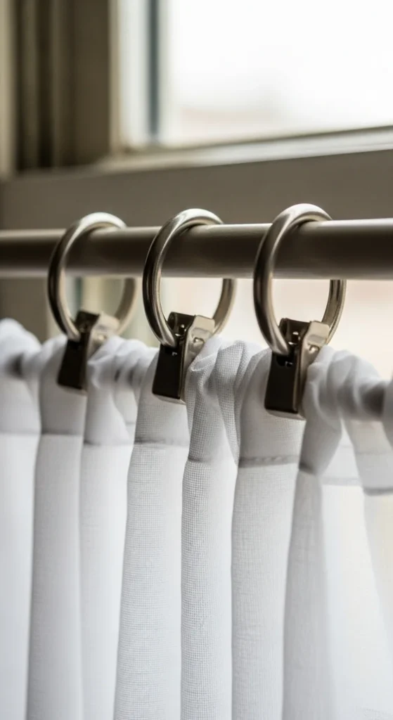 Clip rings give curtains a relaxed, airy look. They work well with linen fabrics. Use them to hang fabric you already own—tablecloths, sheets, or leftover scraps. This saves cost and keeps things flexible. Clip rings make it simple to adjust the curtain height. If your fabric wrinkles, steam it for a smooth effect. Mixing gold or black clips with white fabric adds contrast. Keep the spacing even so the fabric falls neatly.