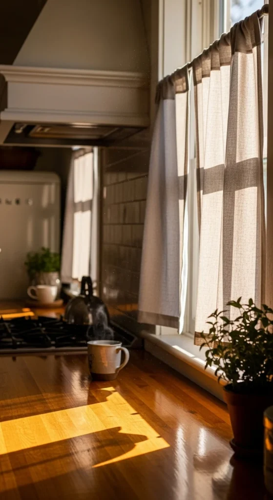 Café curtains cover only the lower half of your window, making them great for kitchens where you want privacy but still want bright views. Choose cotton or linen so the fabric hangs lightly. You can hang them on a tiny tension rod without drilling. Try fun patterns like gingham or stripes if you want personality. They work especially well if your sink is right under the window. If the rod keeps slipping, add small adhesive hooks on the sides for extra support. You can sew the curtains yourself using leftover fabric, which keeps the project cheap. Mix them with a top valance if you want a charming farmhouse look without clutter.