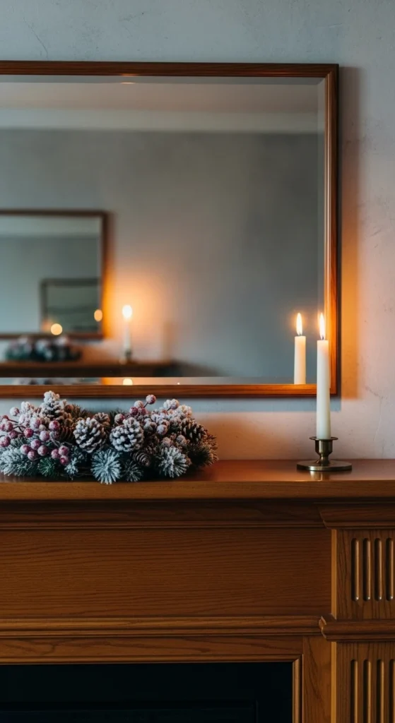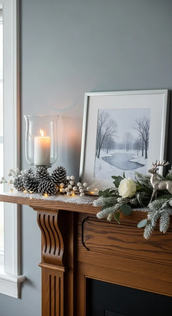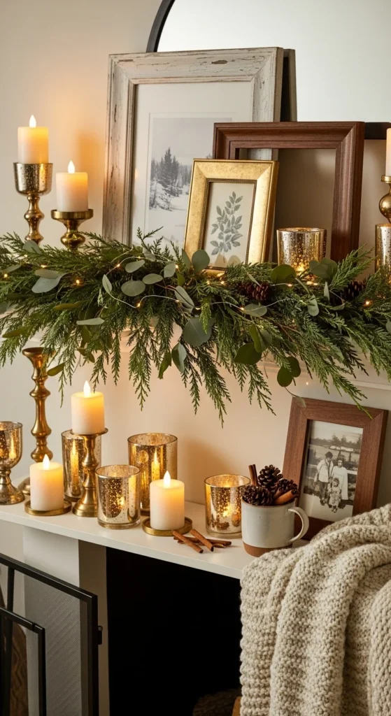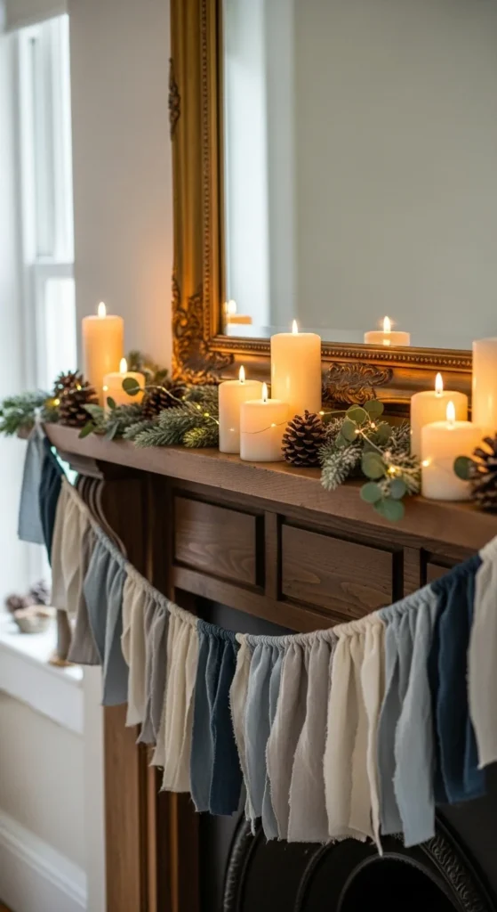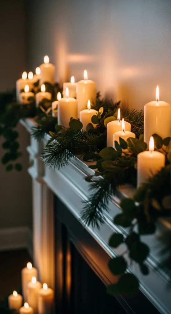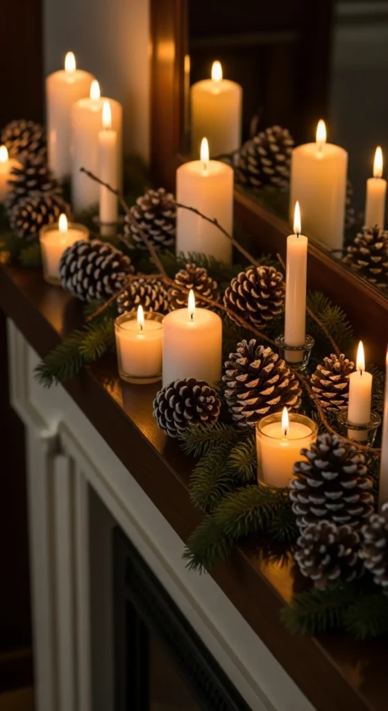 Candle clusters create an instant sense of comfort. Arrange candles of different heights in groups of three or five along the mantel. Use simple white or cream tones to keep the look calm. Tuck small pieces of pine or eucalyptus between them for a natural winter feel.