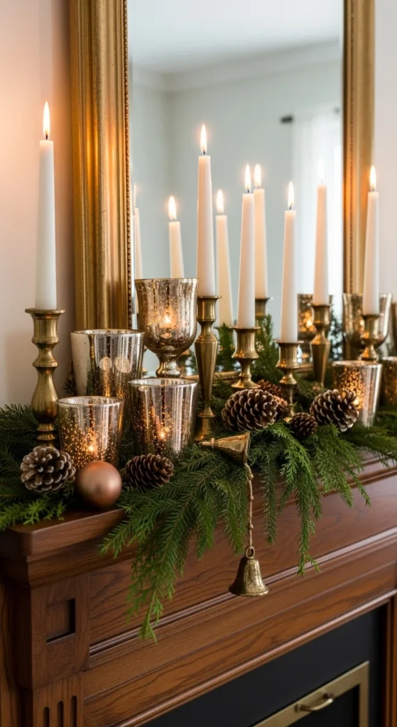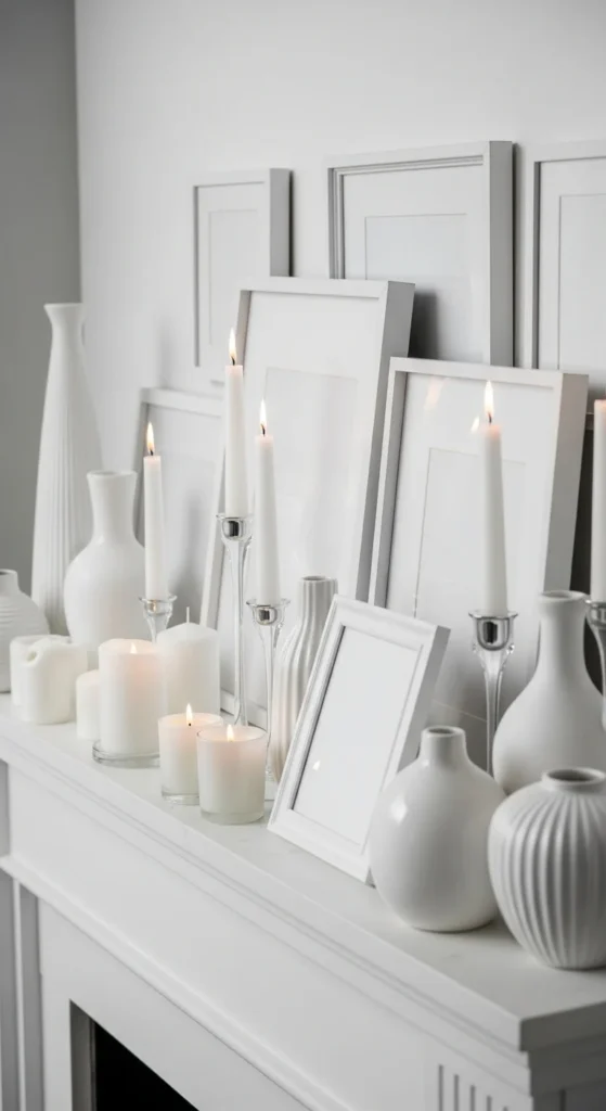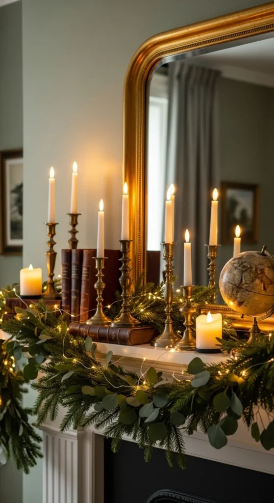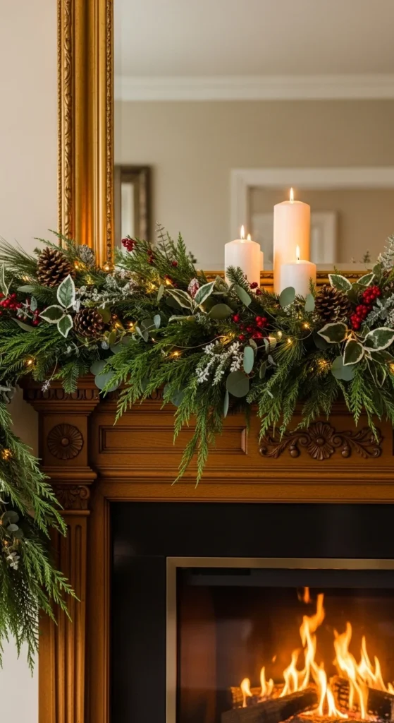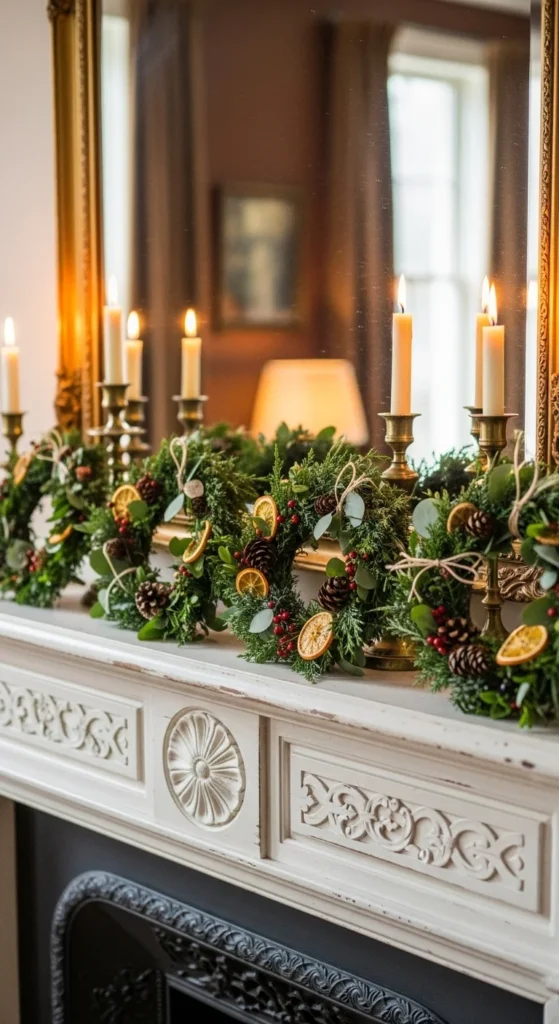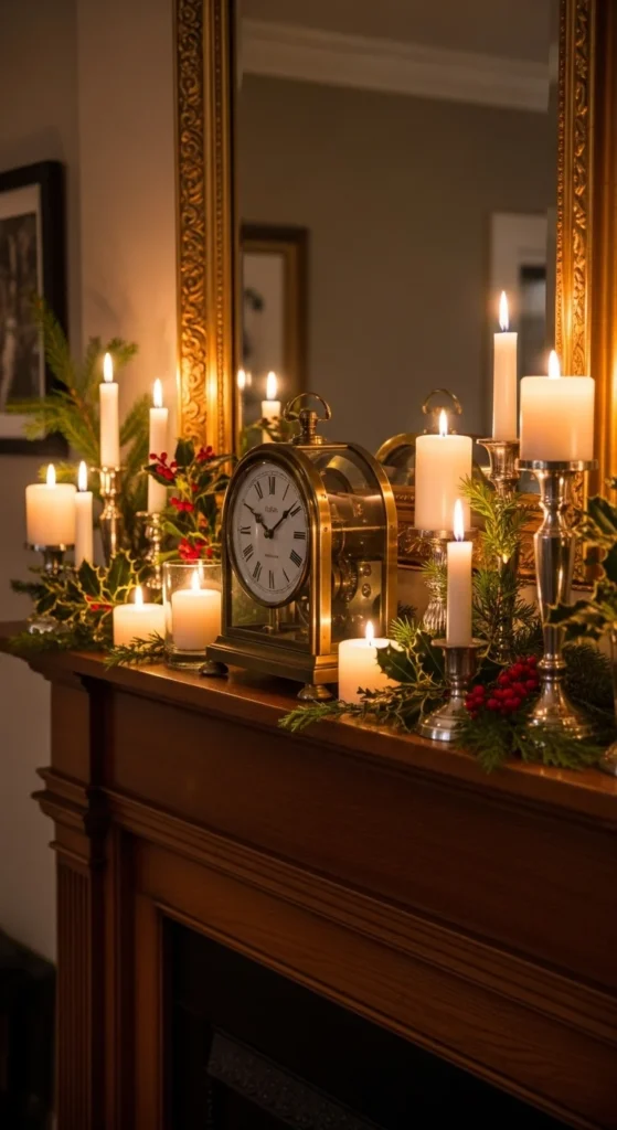 Candle clusters create an instant sense of comfort. Arrange candles of different heights in groups of three or five along the mantel. Use simple white or cream tones to keep the look calm. Tuck small pieces of pine or eucalyptus between them for a natural winter feel.