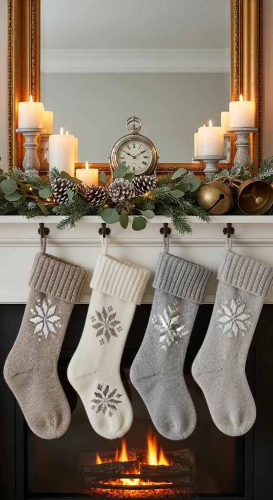 Hang neutral-toned stockings with simple hooks. Stick to soft fabrics like knit or linen.