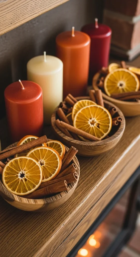 Place dried orange slices and cinnamon sticks in a small bowl. The natural scent fills the room gently.