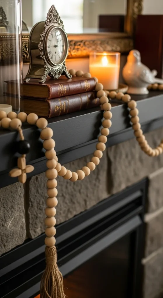 Wooden bead garlands add soft movement to the mantel. Drape one loosely across candleholders, frames, or small vases. The natural texture pairs beautifully with winter décor.