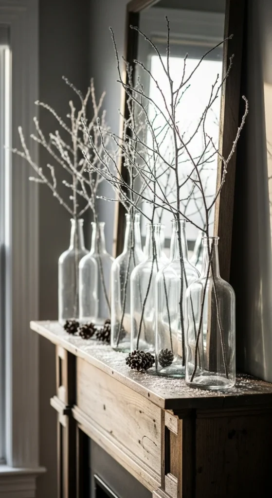Bare branches bring an outdoor feel inside. Place a few in glass bottles of different shapes. Keep them slightly tall so they draw the eye upward.