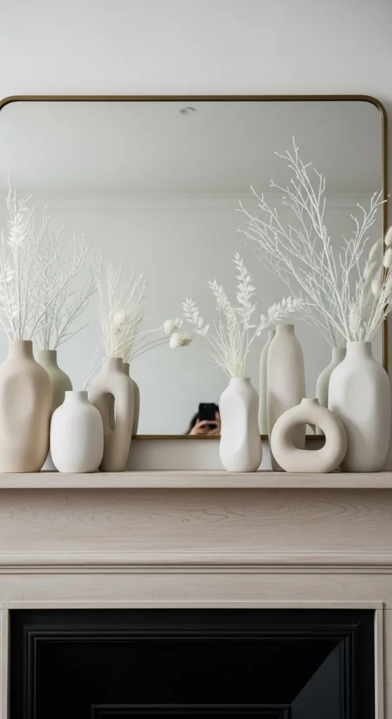 Ceramic vases in neutral tones give a calm and earthy feel. Choose different heights and shapes. Place them in a loose group rather than a straight line.
