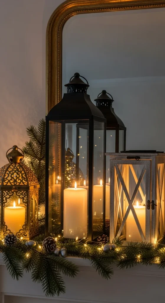Lanterns bring a soft glow and structure. Place one large lantern on one end and a smaller one on the other.