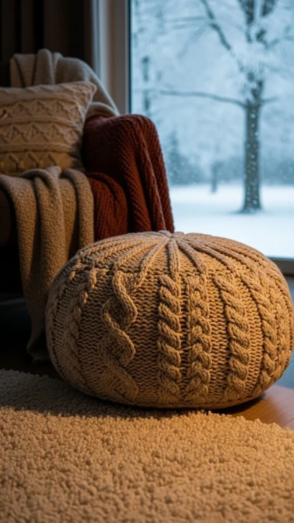 Poufs complement plants beautifully. Place one beside a tall plant or near a cluster of small pots. This adds organic softness to the area. Choose natural knit tones like cream or sand so the pouf blends naturally with plant textures. If your plant is tall, the pouf provides a grounding element. Add a small basket nearby for extra depth. Plants and knitted décor together create a quiet winter atmosphere.