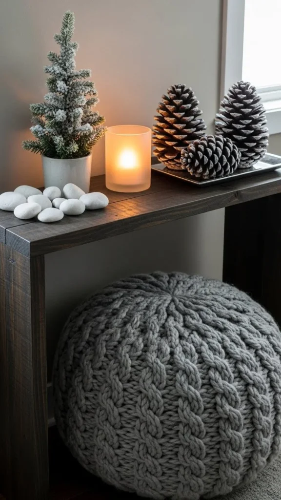 A chunky knit pouf brings instant warmth to a seating area. Place it beside your sofa so it works as a footrest or extra seat when needed. Choose soft neutrals like grey, cream, or taupe for a calm winter look. If you’re working with a small budget, pick a pouf cover instead of a fully filled pouf. You can stuff it with spare blankets or pillows for firmness. Keep the nearby décor soft—think textured throws or a woven basket. This keeps the space visually connected without adding clutter. A knitted pouf also helps soften the straight edges of furniture, making the living room feel more relaxed. Whether the room is small or spacious, this simple setup adds tactile comfort and subtle texture.