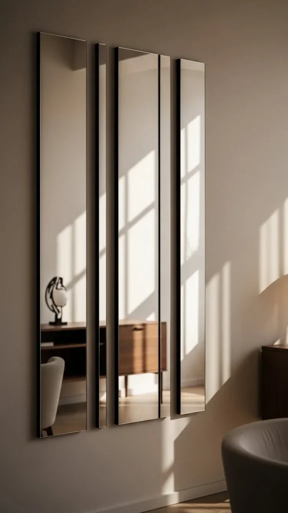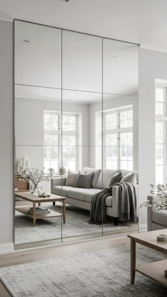 A full-length mirror panel wall creates immediate visual expansion. The tall reflection draws light upward and outward, making ceilings feel higher and rooms feel wider. This works well in living rooms, dining areas, or bedrooms where one uninterrupted wall is available.