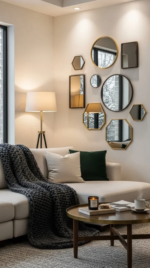 Mirror-accent walls are especially effective during winter, when natural light feels limited and rooms can appear smaller. Reflective surfaces spread available light, repeat cozy textures, and visually widen interiors without renovation. From compact apartments to spacious homes, mirror walls help interiors feel open, calm, and balanced. The ideas below focus on practical, winter-friendly mirror-accent wall styles that can be created with simple planning and affordable materials.