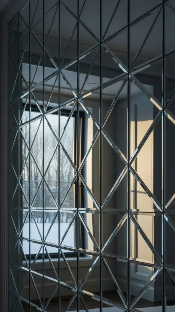 Grid-style mirror walls break reflections into sections, which keeps the space visually organized. The repeated pattern adds structure while still reflecting light.
