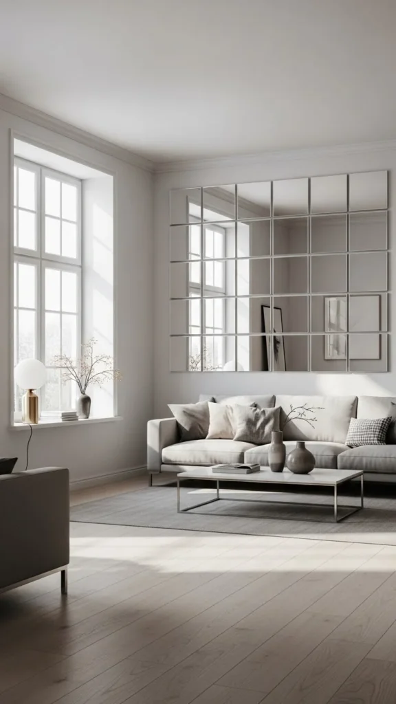 Placing mirrors behind a sofa adds depth without moving furniture. The reflection visually extends the seating area.