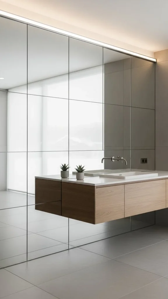 Vertical mirror strips pull the eye upward, helping ceilings feel taller.