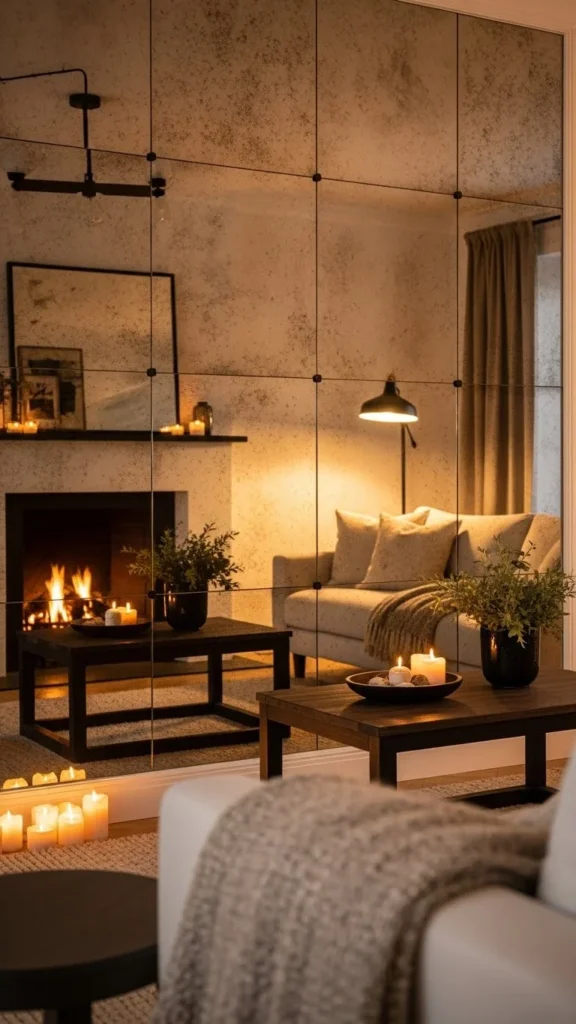 During winter, this wall reflects lamps, candles, and layered textiles, doubling warmth without adding clutter. Keep nearby decor minimal so reflections stay calm and uncluttered.