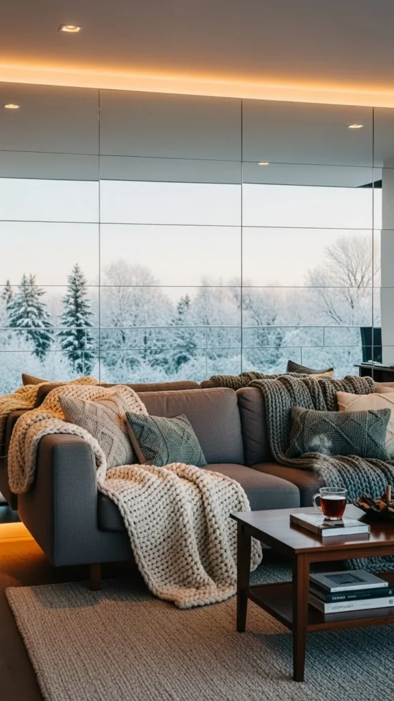 Winter textures like wool throws and cushions appear doubled, adding visual warmth without extra items.