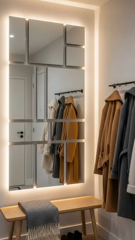 Entryways often feel dark in winter. A mirror wall reflects available light and opens the space instantly.