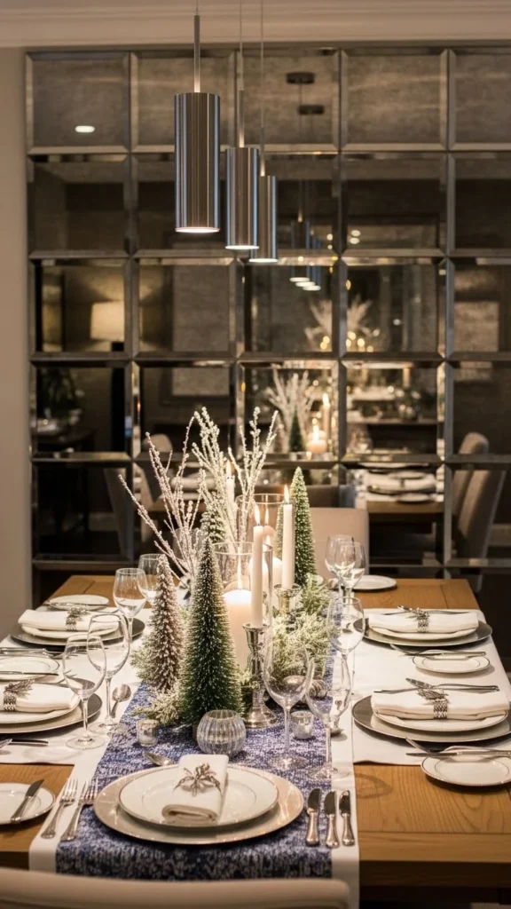 Dining mirror walls reflect pendant lights and table settings, adding warmth during winter meals.