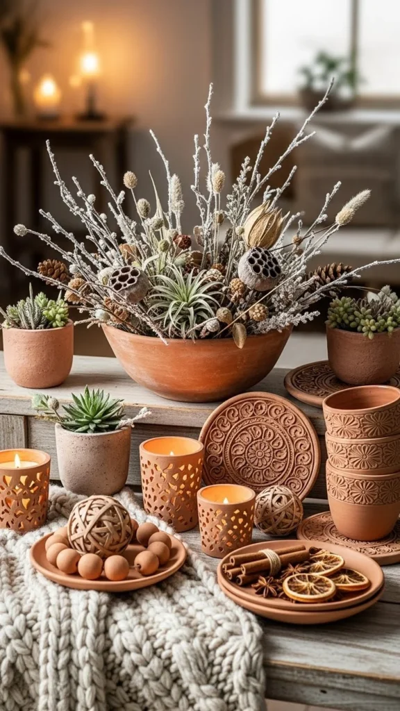 Place winter spices—cinnamon sticks, star anise, cloves—in a terracotta bowl. Use it as a small tabletop accent. The warm clay complements the rich tones of the spices. Add a linen coaster for softness. This little detail adds cozy winter charm.