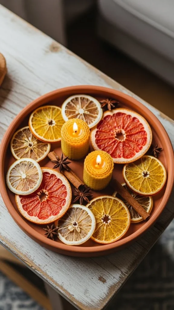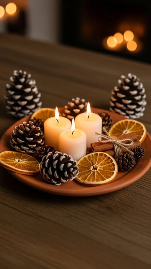 Place candles on a terracotta tray and scatter dried citrus slices around them. The orange tones pair beautifully with clay. Add small pine sprigs for texture. If you want to DIY, dry citrus slices in the oven and reuse them all season. This accent brings color, scent, and warmth to winter nights.