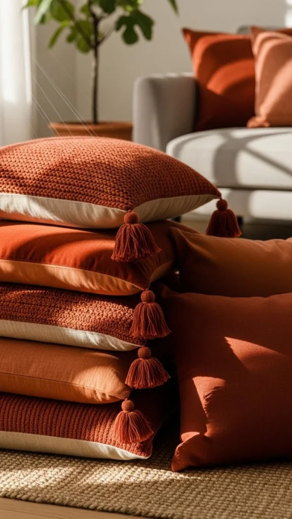 Add terracotta-colored pillows to sofas or chairs. Choose textured fabrics like cotton knit or boucle. Pair them with neutral throws for balance. If you want a budget solution, buy terracotta pillow covers instead of full pillows. This adds color without clutter.