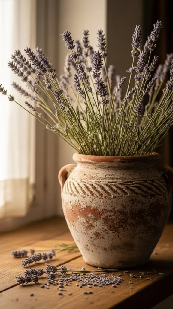 Dried lavender pairs beautifully with earthy clay tones. Fill a terracotta planter with lavender stems for soft winter charm. Place it on a bedside table or shelf. Add a fabric coaster under the pot for extra warmth. This scent brings quiet coziness to winter rooms.