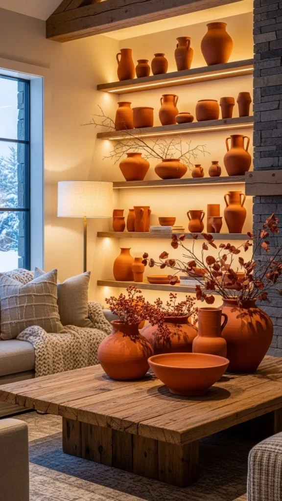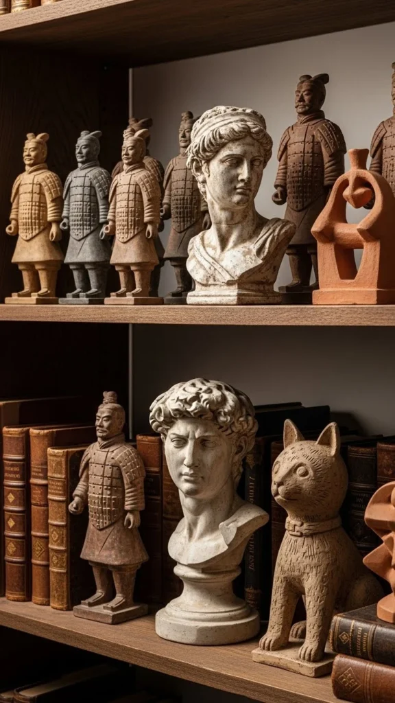 Small terracotta sculptures add artistic character. Place one beside books or vases for balance. Choose organic shapes for a modern-earthy vibe. For a low-cost option, make your own sculpture using air-dry clay and terracotta paint. This brings calm, grounded texture to shelves.