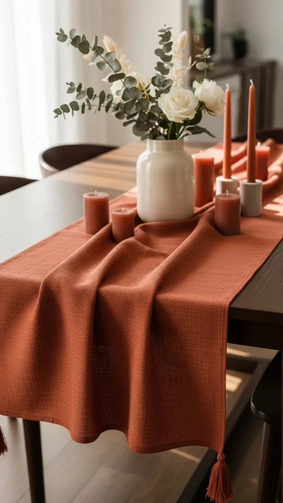 A terracotta-colored runner adds warmth to dining tables. Choose cotton or linen for winter comfort. Add neutral plates and wooden accents. If you’re saving money, cut fabric yardage into a simple runner. This color grounds the table during winter gatherings.