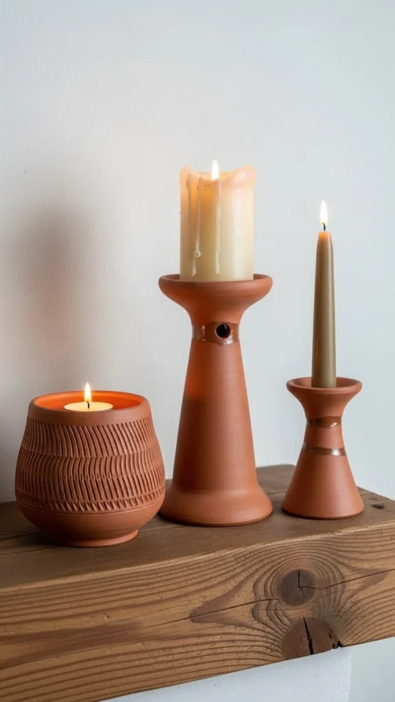 Terracotta candle holders create a warm glow on winter evenings. Arrange several in different heights across your mantel. Use cream or beige candles to create a soft palette. Add a few pine sprigs for seasonal texture. For a cost-friendly project, make mini terracotta holders using small clay pots turned upside down. This creates height and charm without extra work. Keep the arrangement simple to let the clay tones shine.