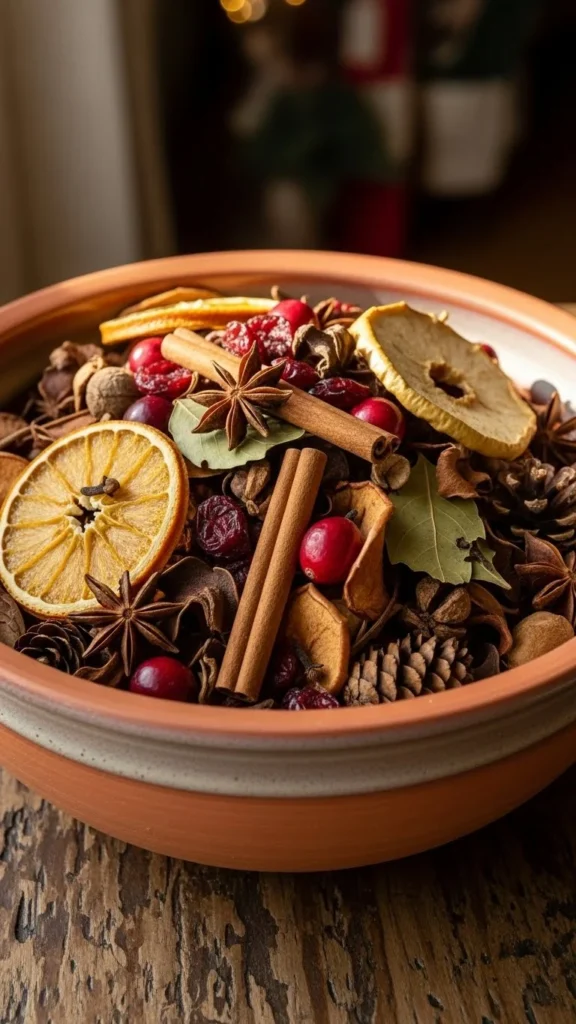 Fill a terracotta bowl with winter potpourri—pine, orange slices, and cloves. The warm clay enhances the scents. Place the bowl in an entryway or living room. For a budget-friendly version, dry citrus slices at home and mix them with pinecones. This adds both fragrance and color.
