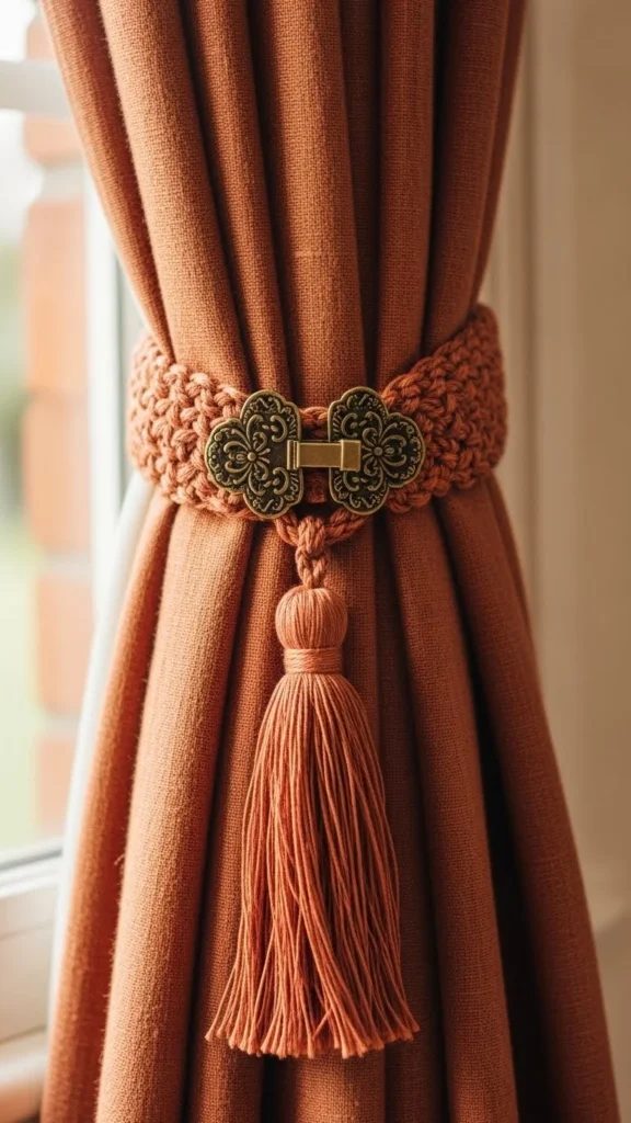 Use terracotta-colored fabric or rope as curtain tiebacks. This subtle accent warms up the room without adding clutter. Pair it with neutral curtains for contrast. For a low-cost version, braid together pieces of terracotta-colored yarn.