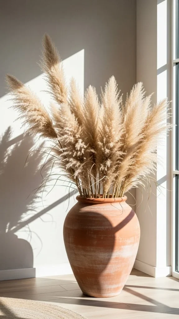 A tall terracotta floor pot anchors empty corners. Fill it with dried pampas grass for winter softness. Choose neutral pampas for a calm look. Place the pot near a window or fireplace for a natural glow. If you want an affordable option, choose faux pampas—they look full and require no care. This combination adds elegant height and warmth to winter interiors.