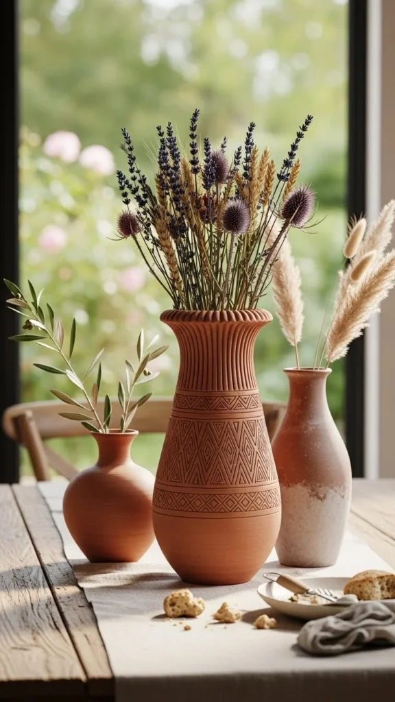 Mixing three vases creates gentle dimension. Choose terracotta pieces in different heights and shapes. Place them along the center of your dining table. Add a few dried winter stems to one vase and leave the others empty. This keeps the look balanced. For a low-cost version, look for thrifted clay vases and repaint them with terracotta-style matte paint.