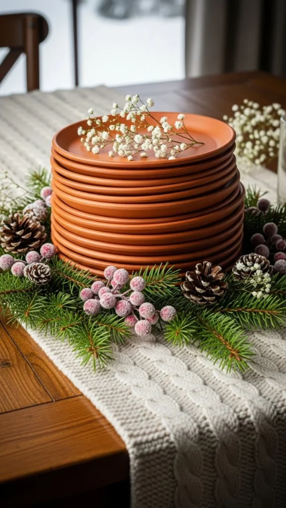 Terracotta plates add earthy charm to winter meals. Stack them on your dining table with linen napkins in warm tones. Add a small sprig of rosemary or winter greenery to each plate. If you want to stay on budget, mix terracotta-colored melamine plates with real clay pieces. The color ties everything together. This creates a grounded, rustic winter table setting.