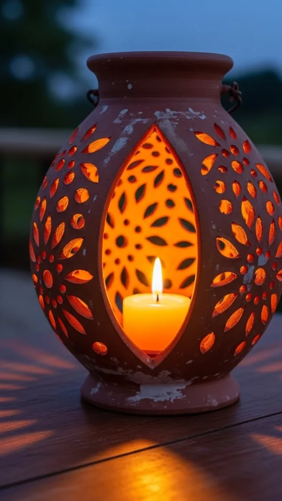 Terracotta lanterns give off a soft, diffused glow. Choose one with cutout patterns so light spills out gently. Place it on a side table or shelf. Add a battery candle for safety. If you’re watching costs, make a lantern using a clay pot with holes drilled into the sides. The warm glow fits perfectly into winter evenings.