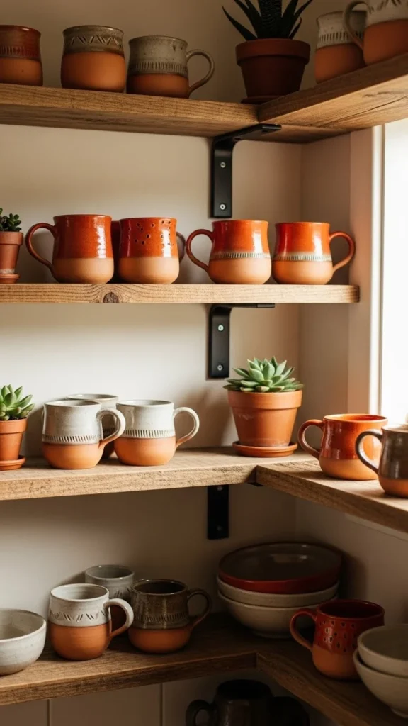 Open shelving looks cozy with terracotta mugs. Stack two or three and place them near wooden or matte dishes. The color warms up the entire shelf. For budget styling, use terracotta-colored ceramic instead of pure clay. Add a sprig of winter greenery nearby for subtle character.