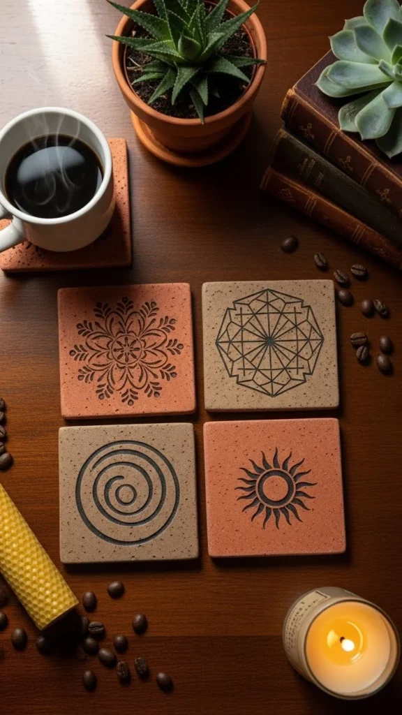 Use square terracotta tiles as coasters. They add rustic texture to winter setups. Place them under mugs, candles, or small vases. If you want extra stability, add felt pads under each tile. This is an inexpensive way to add clay tones throughout the room.